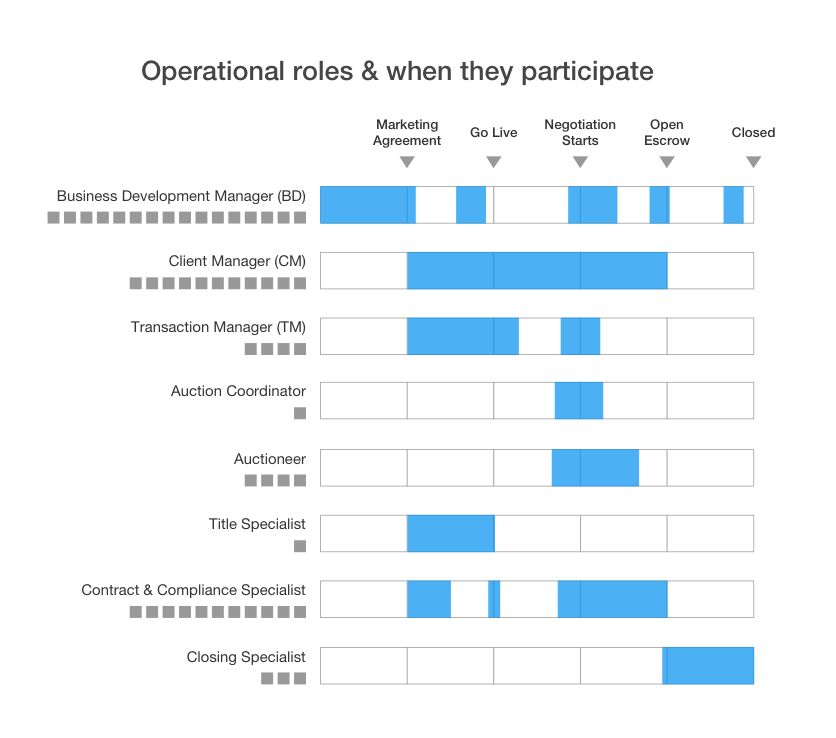 The following diagram helps us see the activity levels of the different user types across the major stages of a deal cycle.