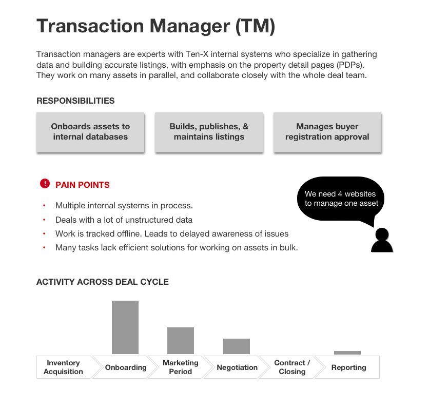 Armed with data from interviews and workshops, I created personas for each of the major internal user types.