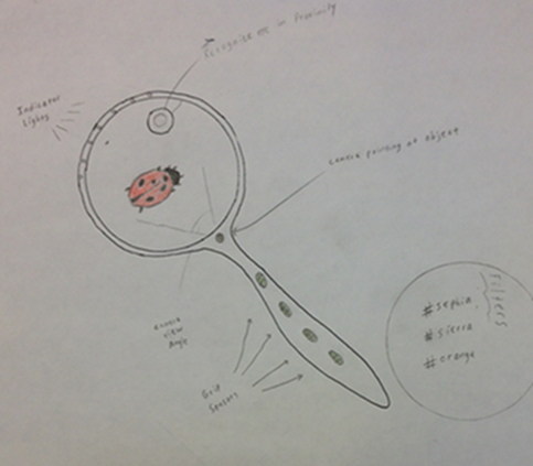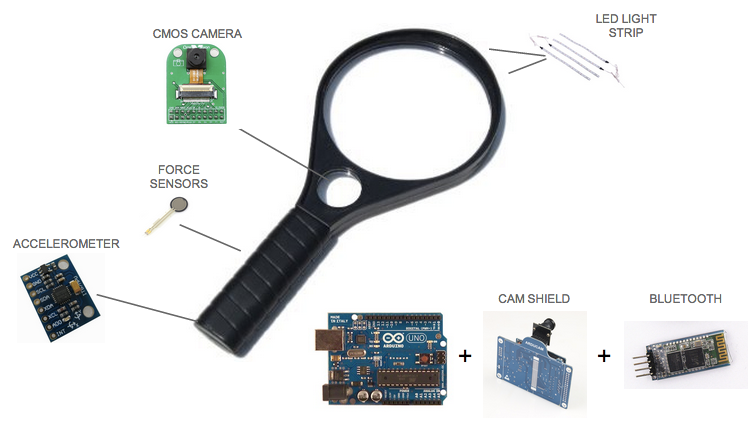 Sensors allow the device to detect when it is being actively held, and if it is currently in motion. When the user pauses over an item to inspect it in detail, a camera mounted to the lens captures the subject of the user’s interest. Operation of the device is intuitively the same as using a regular magnifying glass.