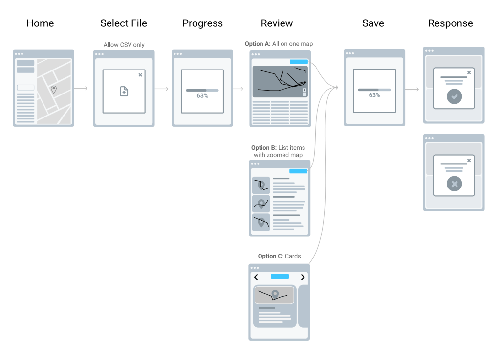 Mapped task flows as a thinking tool, evaluating user options at each step. And also as a visual aid when driving team discussions and alignment. I created screens like these quickly with the help of a Figma plugin.