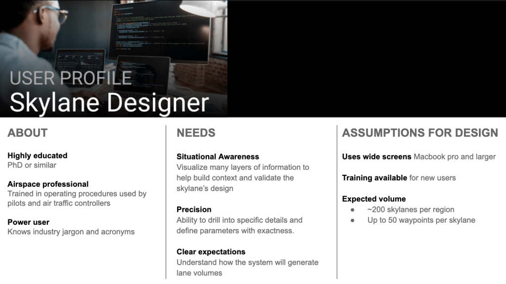 Conducted discovery with intended users to understand their perspectives and challenges. The user is an airspace engineer who needs a tool that can build their confidence that planned routes are safe and valid.